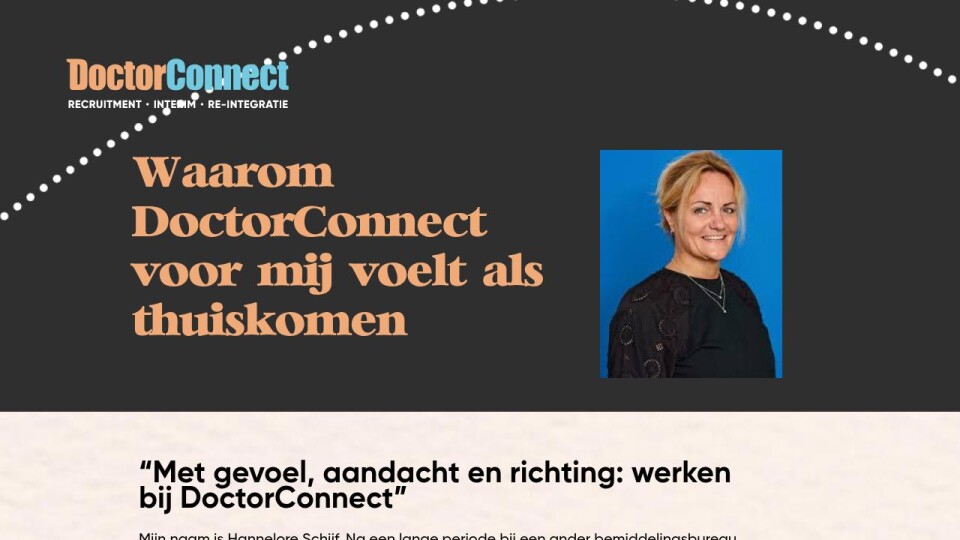 Wat ik het mooiste vind aan werken bij DoctorConnect, is dat de artsen écht centraal staan. We luisteren met oprechte aandacht, denken mee en adviseren op maat. Geen standaard trajecten of druk om te ‘plaatsen’, maar een benadering die draait om vertrouwen en kwaliteit. Dat maakt ons werk zinvol en geeft elke dag opnieuw voldoening.