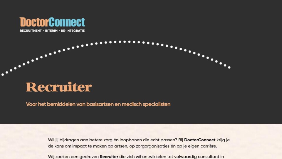 Als Recruiter bij DoctorConnect speel je een belangrijke rol in de loopbaan van artsen én in het succes van zorgorganisaties. Je gaat in gesprek met kandidaten, verdiept je in hun wensen en ambities en zoekt actief naar de best passende werkplek.